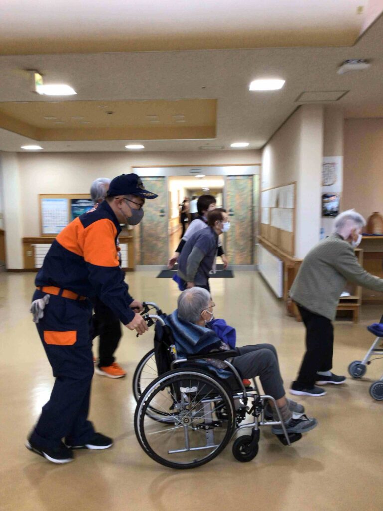 地域の方のお力をお借りし、実際の場面を想定しながら、入居者様を安全に避難誘導することができました。